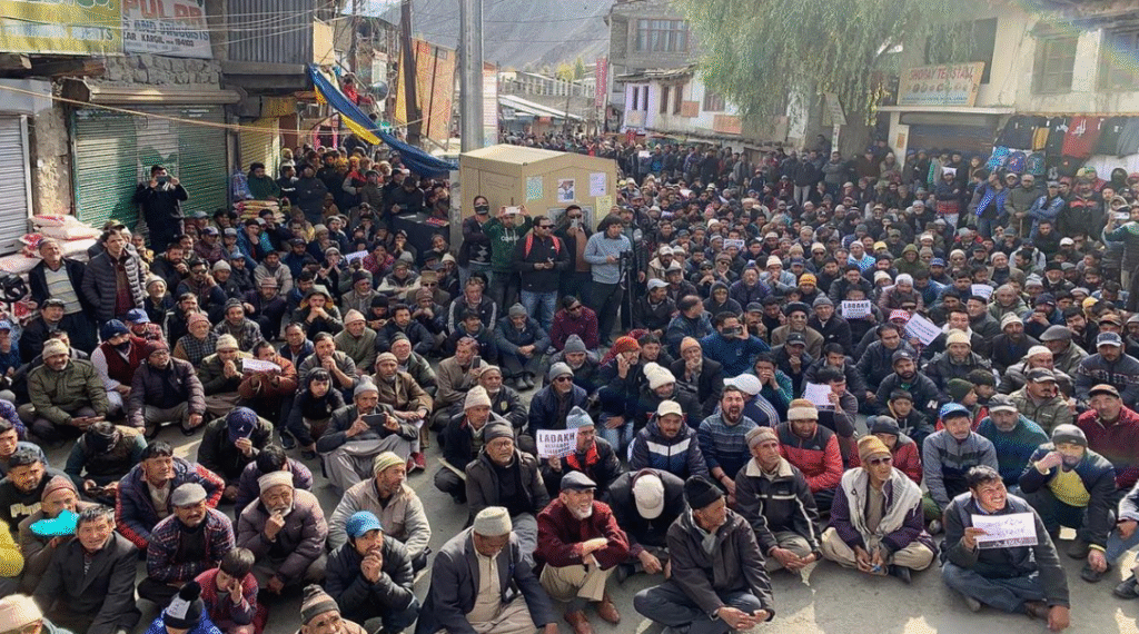-In response to a protest call, Leh town was shut down on Wednesday, and large crowds gathered at the NDS memorial ground before marching through the streets, chanting slogans in support of the Sixth Schedule and statehood.