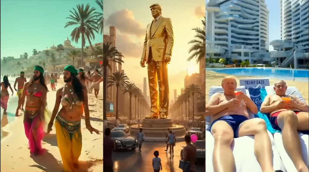 The video shows a rebuilt “Riviera” in Gaza, golden balloons with Trump’s face on them, golden statues of the President and AI images of him and Israeli Prime Minister Benjamin Netanyahu lounging on the beach.